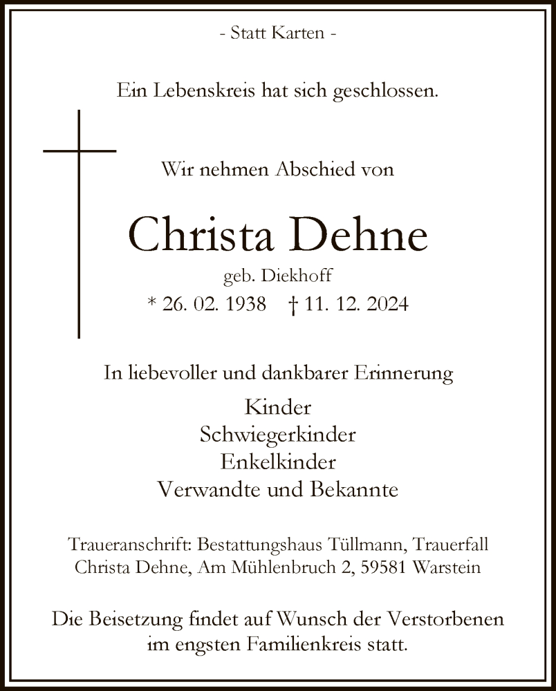 Hier finden Sie alle Traueranzeigen aus der Zeitung, die bisher für Christa Dehne erschienen sind. Weitere Traueranzeigen, die in der Zeitung erscheinen, werden hier ebenfalls aufgelistet