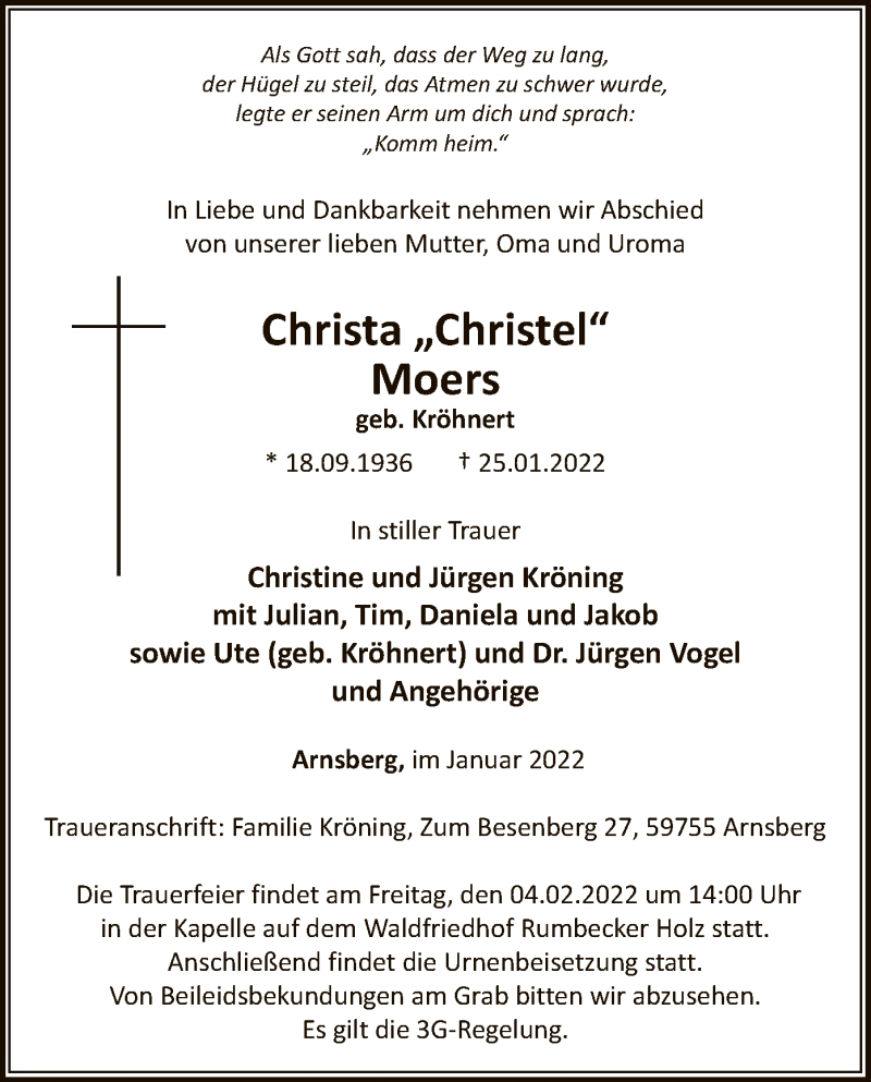 Hier finden Sie alle Traueranzeigen aus der Zeitung, die bisher für Christa Moers erschienen sind. Weitere Traueranzeigen, die in der Zeitung erscheinen, werden hier ebenfalls aufgelistet
