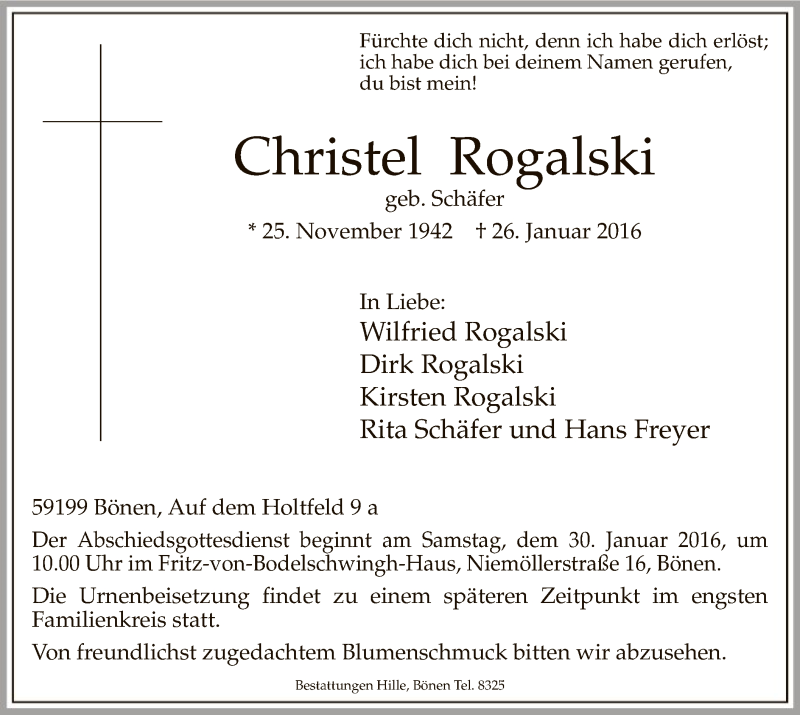 Hier finden Sie alle Traueranzeigen aus der Zeitung, die bisher für Christel Rogalski erschienen sind. Weitere Traueranzeigen, die in der Zeitung erscheinen, werden hier ebenfalls aufgelistet