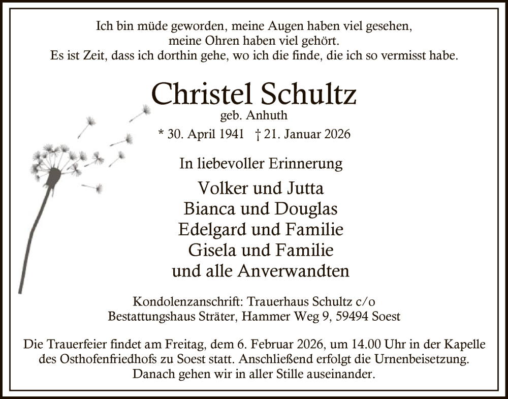 Hier finden Sie alle Traueranzeigen aus der Zeitung, die bisher für Christel Schultz erschienen sind. Weitere Traueranzeigen, die in der Zeitung erscheinen, werden hier ebenfalls aufgelistet