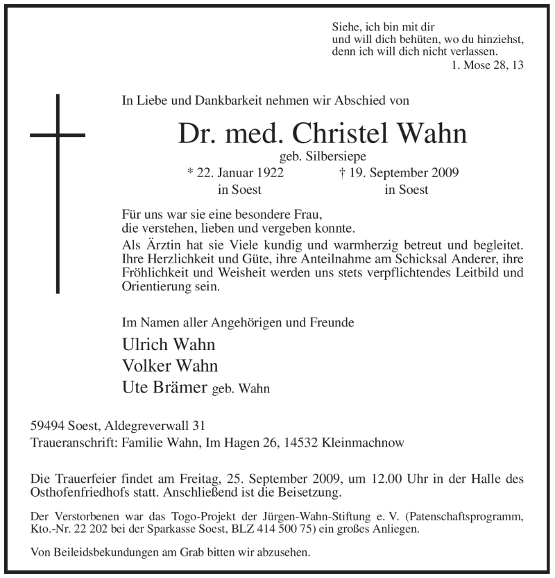 Hier finden Sie alle Traueranzeigen aus der Zeitung, die bisher für Christel Wahn erschienen sind. Weitere Traueranzeigen, die in der Zeitung erscheinen, werden hier ebenfalls aufgelistet