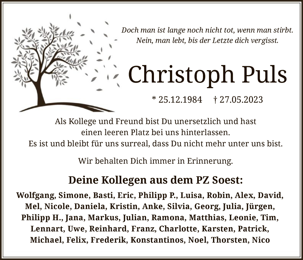 Hier finden Sie alle Traueranzeigen aus der Zeitung, die bisher für Christoph Puls erschienen sind. Weitere Traueranzeigen, die in der Zeitung erscheinen, werden hier ebenfalls aufgelistet