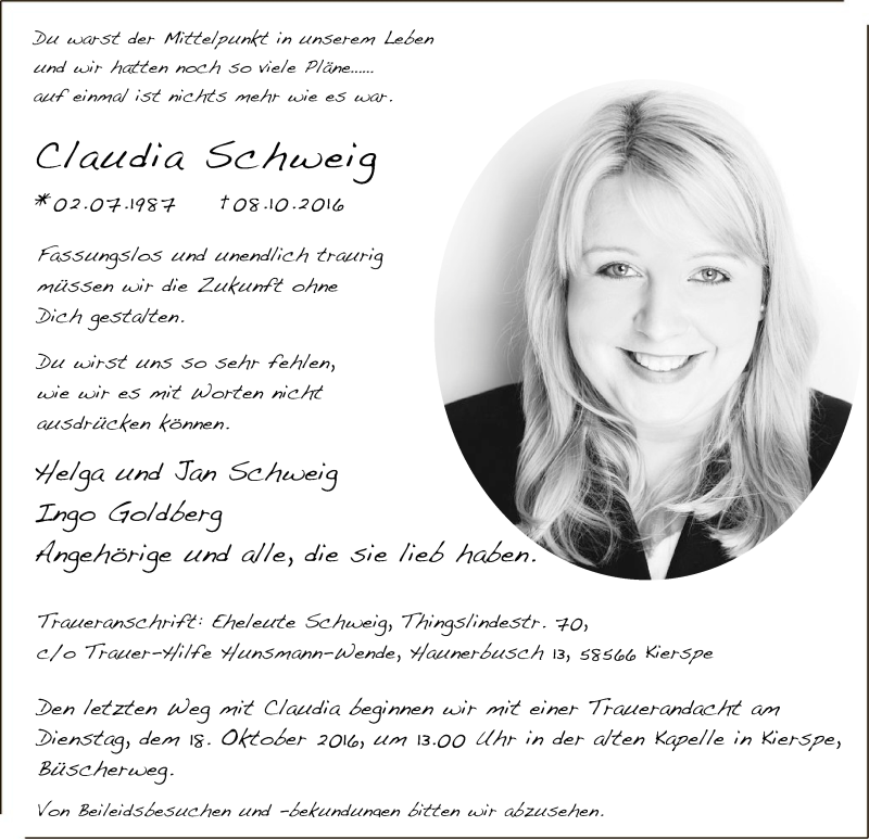 Hier finden Sie alle Traueranzeigen aus der Zeitung, die bisher für Claudia Schweig erschienen sind. Weitere Traueranzeigen, die in der Zeitung erscheinen, werden hier ebenfalls aufgelistet