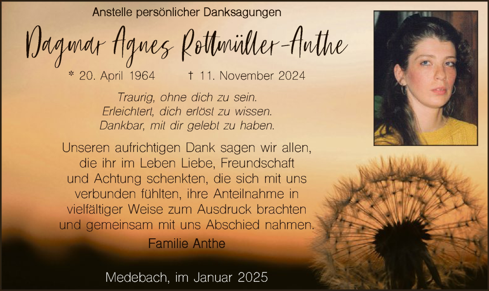 Hier finden Sie alle Traueranzeigen aus der Zeitung, die bisher für Dagmar Agnes Rottmüller-Anthe erschienen sind. Weitere Traueranzeigen, die in der Zeitung erscheinen, werden hier ebenfalls aufgelistet