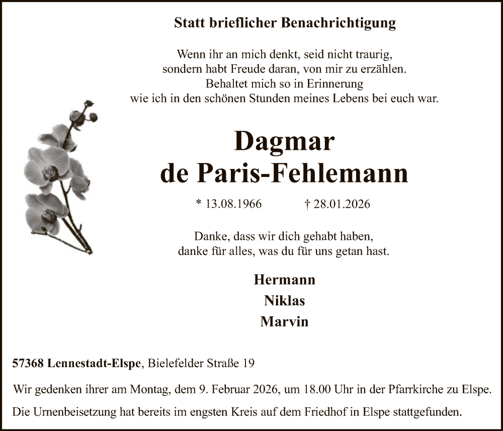 Hier finden Sie alle Traueranzeigen aus der Zeitung, die bisher für Dagmar de Paris-Fehlemann erschienen sind. Weitere Traueranzeigen, die in der Zeitung erscheinen, werden hier ebenfalls aufgelistet