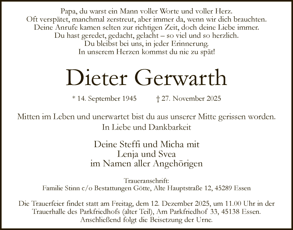 Hier finden Sie alle Traueranzeigen aus der Zeitung, die bisher für Dieter Gerwarth erschienen sind. Weitere Traueranzeigen, die in der Zeitung erscheinen, werden hier ebenfalls aufgelistet