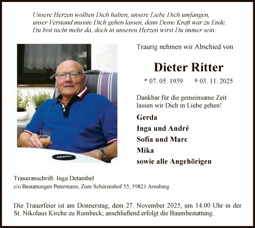 Hier finden Sie alle Traueranzeigen aus der Zeitung, die bisher für Dieter Ritter erschienen sind. Weitere Traueranzeigen, die in der Zeitung erscheinen, werden hier ebenfalls aufgelistet