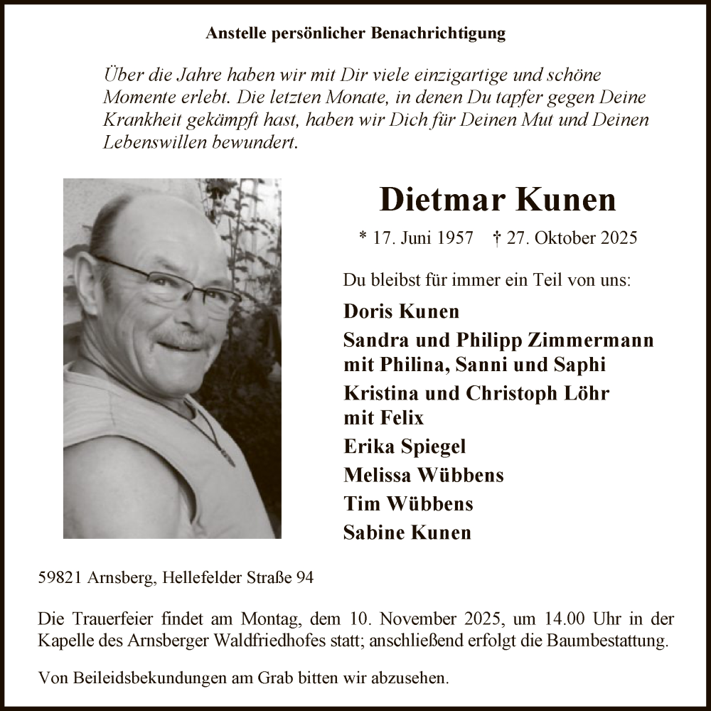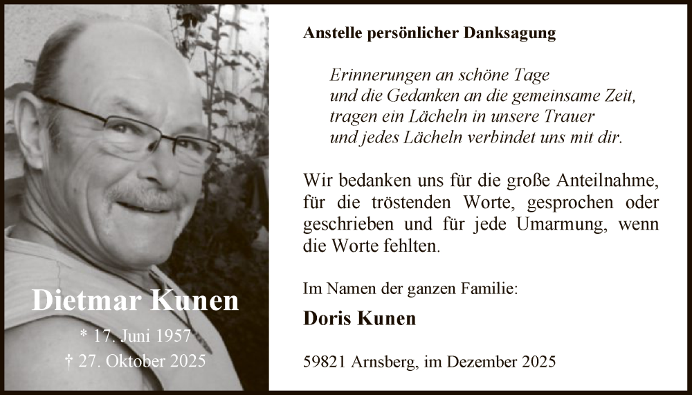 Hier finden Sie alle Traueranzeigen aus der Zeitung, die bisher für Dietmar Kunen erschienen sind. Weitere Traueranzeigen, die in der Zeitung erscheinen, werden hier ebenfalls aufgelistet