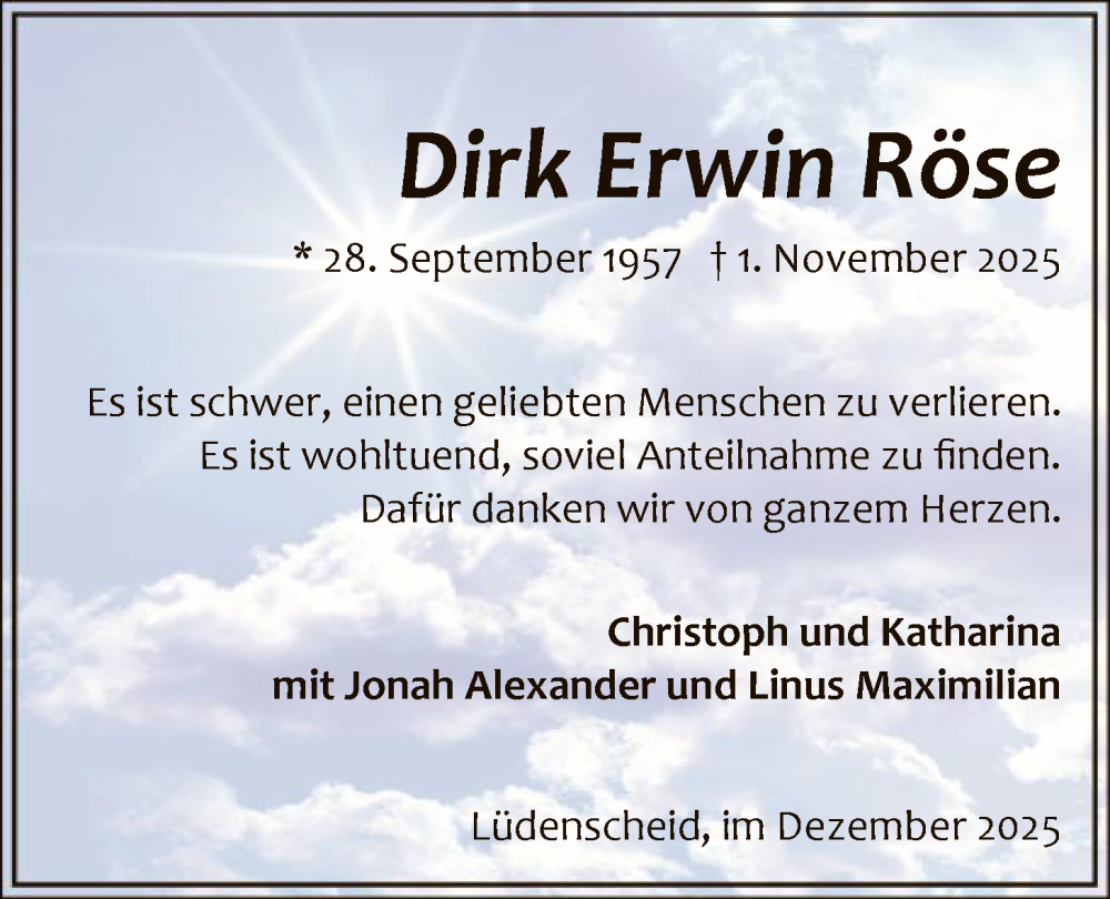 Hier finden Sie alle Traueranzeigen aus der Zeitung, die bisher für Dirk Erwin Röse erschienen sind. Weitere Traueranzeigen, die in der Zeitung erscheinen, werden hier ebenfalls aufgelistet