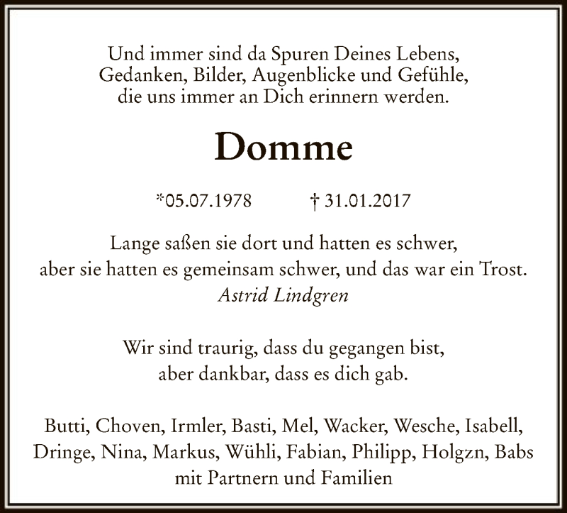 Hier finden Sie alle Traueranzeigen aus der Zeitung, die bisher für Domme erschienen sind. Weitere Traueranzeigen, die in der Zeitung erscheinen, werden hier ebenfalls aufgelistet