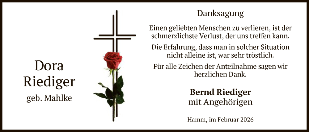 Hier finden Sie alle Traueranzeigen aus der Zeitung, die bisher für Dora Riediger erschienen sind. Weitere Traueranzeigen, die in der Zeitung erscheinen, werden hier ebenfalls aufgelistet