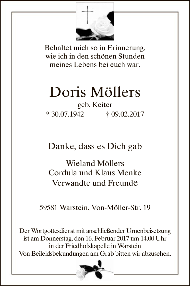 Hier finden Sie alle Traueranzeigen aus der Zeitung, die bisher für Doris Möllers erschienen sind. Weitere Traueranzeigen, die in der Zeitung erscheinen, werden hier ebenfalls aufgelistet