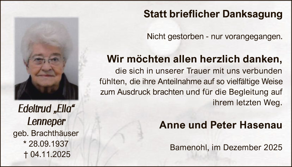 Hier finden Sie alle Traueranzeigen aus der Zeitung, die bisher für Edeltrud Lenneper erschienen sind. Weitere Traueranzeigen, die in der Zeitung erscheinen, werden hier ebenfalls aufgelistet