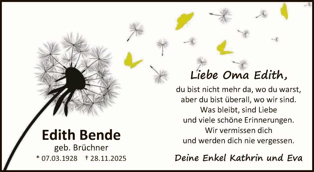 Hier finden Sie alle Traueranzeigen aus der Zeitung, die bisher für Edith Bende erschienen sind. Weitere Traueranzeigen, die in der Zeitung erscheinen, werden hier ebenfalls aufgelistet