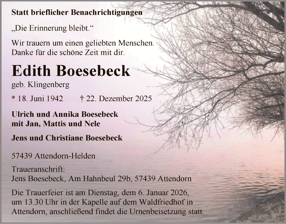 Hier finden Sie alle Traueranzeigen aus der Zeitung, die bisher für Edith Boesebeck erschienen sind. Weitere Traueranzeigen, die in der Zeitung erscheinen, werden hier ebenfalls aufgelistet