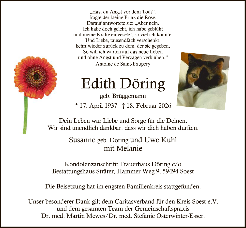 Hier finden Sie alle Traueranzeigen aus der Zeitung, die bisher für Edith Döring erschienen sind. Weitere Traueranzeigen, die in der Zeitung erscheinen, werden hier ebenfalls aufgelistet