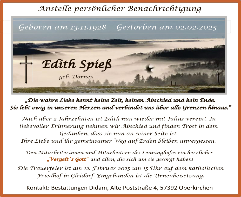 Hier finden Sie alle Traueranzeigen aus der Zeitung, die bisher für Edith Spieß erschienen sind. Weitere Traueranzeigen, die in der Zeitung erscheinen, werden hier ebenfalls aufgelistet
