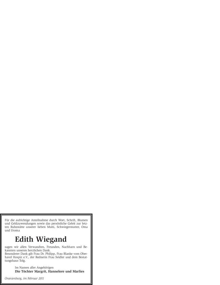 Hier finden Sie alle Traueranzeigen aus der Zeitung, die bisher für Edith Wiegand erschienen sind. Weitere Traueranzeigen, die in der Zeitung erscheinen, werden hier ebenfalls aufgelistet