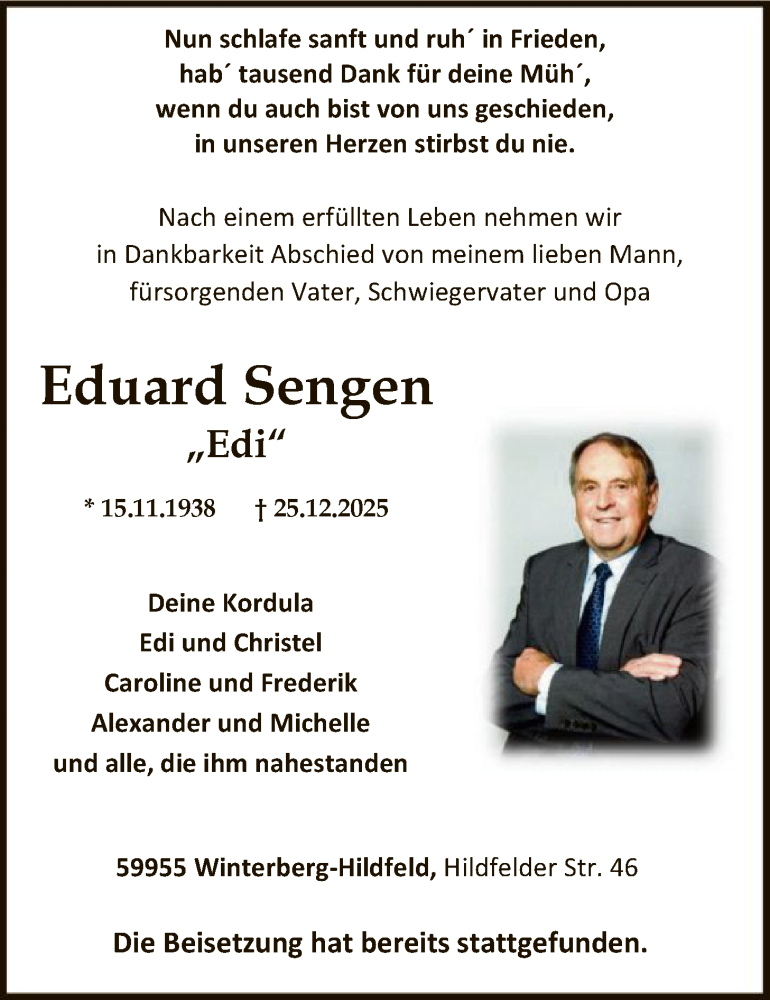 Hier finden Sie alle Traueranzeigen aus der Zeitung, die bisher für Eduard Sengen erschienen sind. Weitere Traueranzeigen, die in der Zeitung erscheinen, werden hier ebenfalls aufgelistet