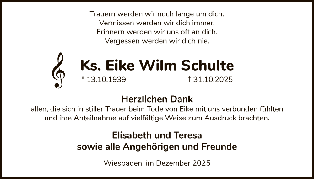 Hier finden Sie alle Traueranzeigen aus der Zeitung, die bisher für Eike Wilm Schulte erschienen sind. Weitere Traueranzeigen, die in der Zeitung erscheinen, werden hier ebenfalls aufgelistet