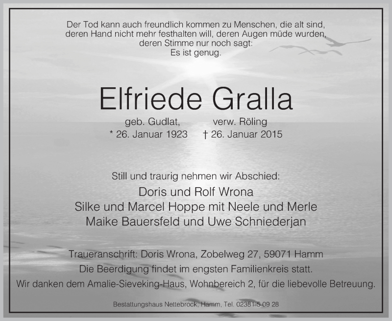Hier finden Sie alle Traueranzeigen aus der Zeitung, die bisher für Elfriede Gralla erschienen sind. Weitere Traueranzeigen, die in der Zeitung erscheinen, werden hier ebenfalls aufgelistet