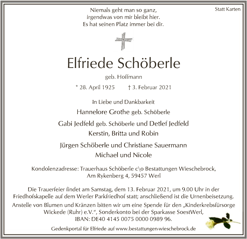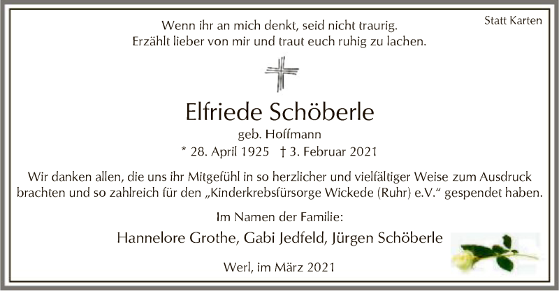 Hier finden Sie alle Traueranzeigen aus der Zeitung, die bisher für Elfriede Schöberle erschienen sind. Weitere Traueranzeigen, die in der Zeitung erscheinen, werden hier ebenfalls aufgelistet