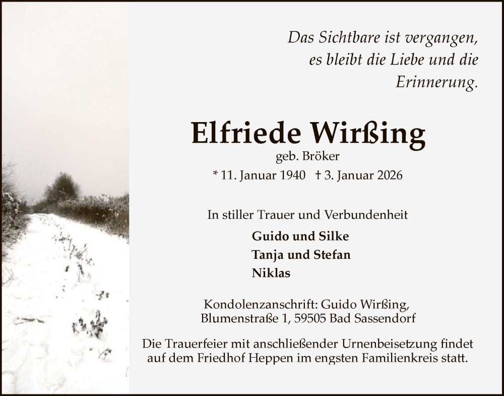Hier finden Sie alle Traueranzeigen aus der Zeitung, die bisher für Elfriede Wirßing erschienen sind. Weitere Traueranzeigen, die in der Zeitung erscheinen, werden hier ebenfalls aufgelistet