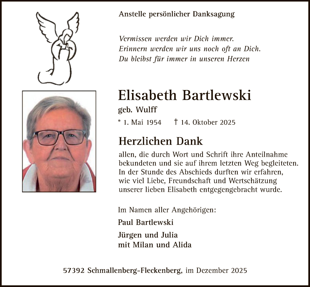 Hier finden Sie alle Traueranzeigen aus der Zeitung, die bisher für Elisabeth Bartlewski erschienen sind. Weitere Traueranzeigen, die in der Zeitung erscheinen, werden hier ebenfalls aufgelistet