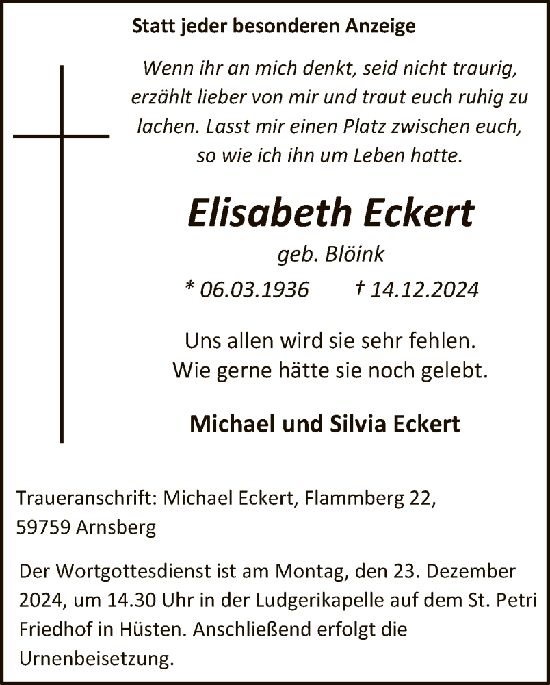 Hier finden Sie alle Traueranzeigen aus der Zeitung, die bisher für Elisabeth Eckert erschienen sind. Weitere Traueranzeigen, die in der Zeitung erscheinen, werden hier ebenfalls aufgelistet