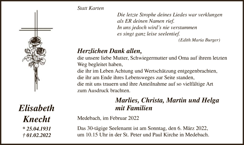 Hier finden Sie alle Traueranzeigen aus der Zeitung, die bisher für Elisabeth Knecht erschienen sind. Weitere Traueranzeigen, die in der Zeitung erscheinen, werden hier ebenfalls aufgelistet