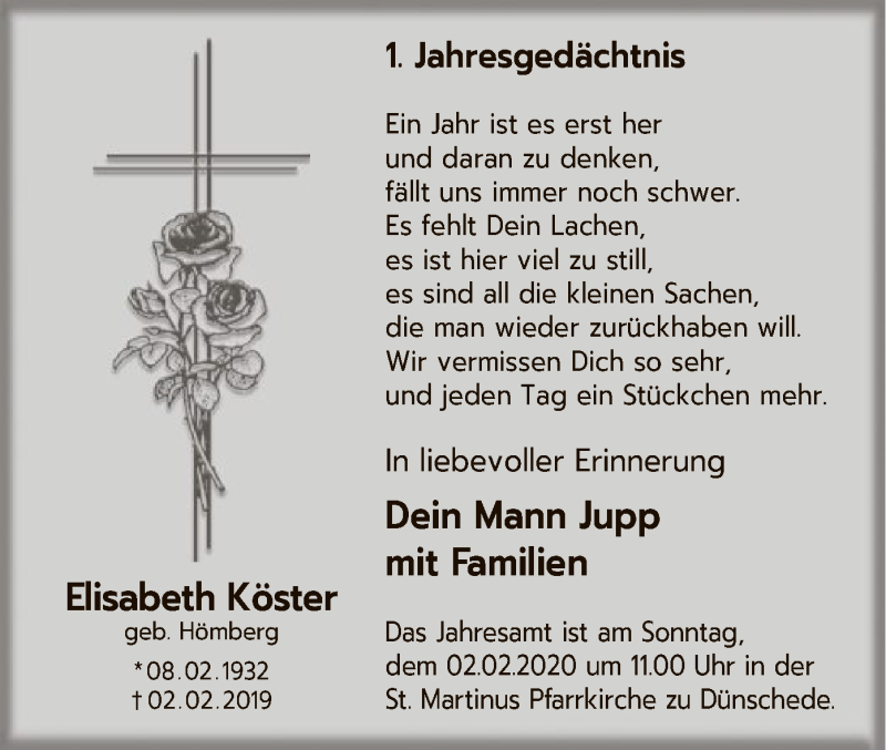Hier finden Sie alle Traueranzeigen aus der Zeitung, die bisher für Elisabeth Köster erschienen sind. Weitere Traueranzeigen, die in der Zeitung erscheinen, werden hier ebenfalls aufgelistet
