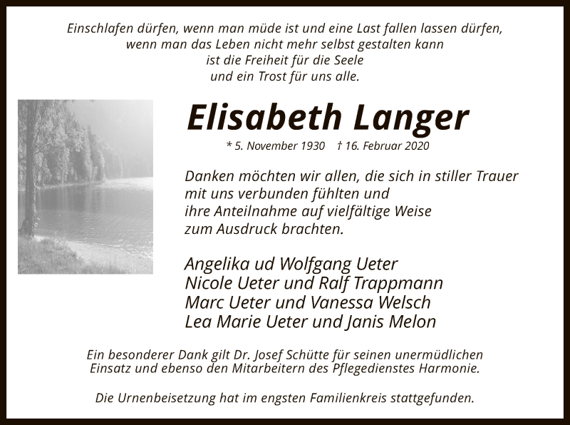 Hier finden Sie alle Traueranzeigen aus der Zeitung, die bisher für Elisabeth Langer erschienen sind. Weitere Traueranzeigen, die in der Zeitung erscheinen, werden hier ebenfalls aufgelistet