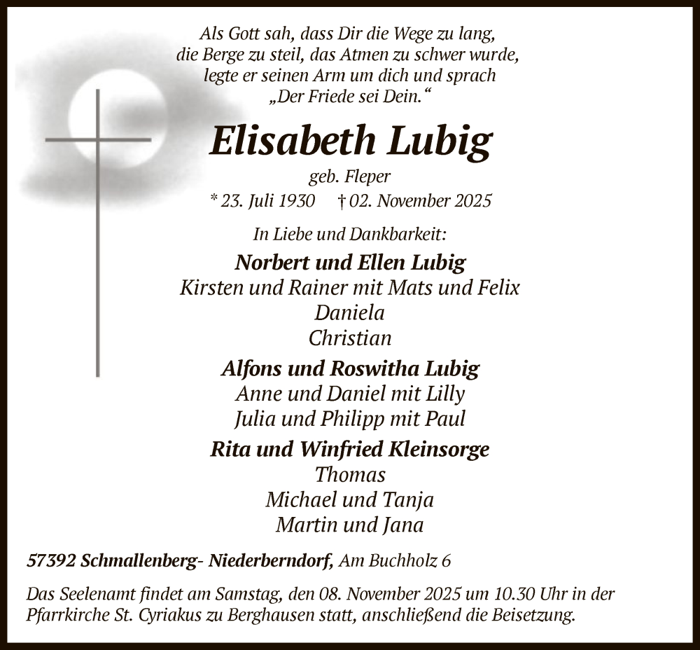 Hier finden Sie alle Traueranzeigen aus der Zeitung, die bisher für Elisabeth Lubig erschienen sind. Weitere Traueranzeigen, die in der Zeitung erscheinen, werden hier ebenfalls aufgelistet