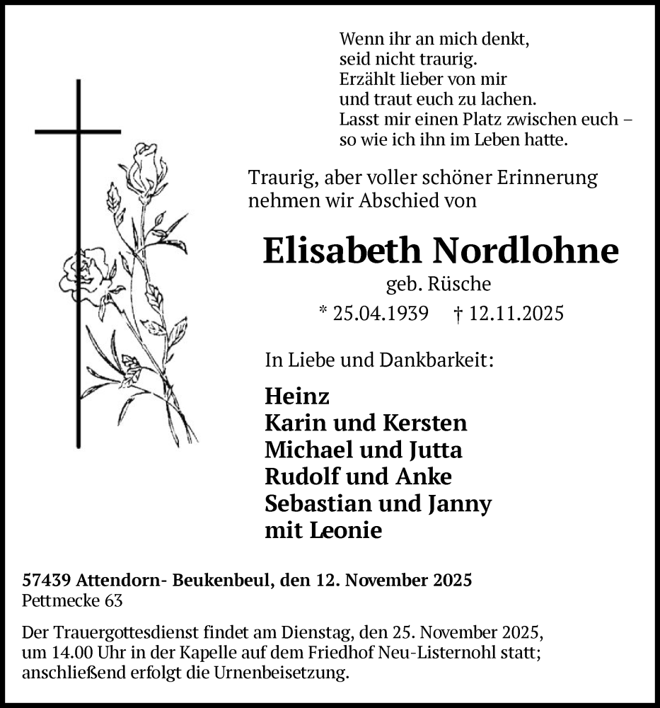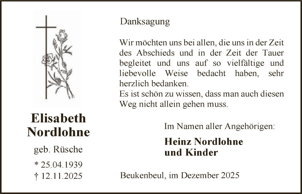 Hier finden Sie alle Traueranzeigen aus der Zeitung, die bisher für Elisabeth Nordlohne erschienen sind. Weitere Traueranzeigen, die in der Zeitung erscheinen, werden hier ebenfalls aufgelistet