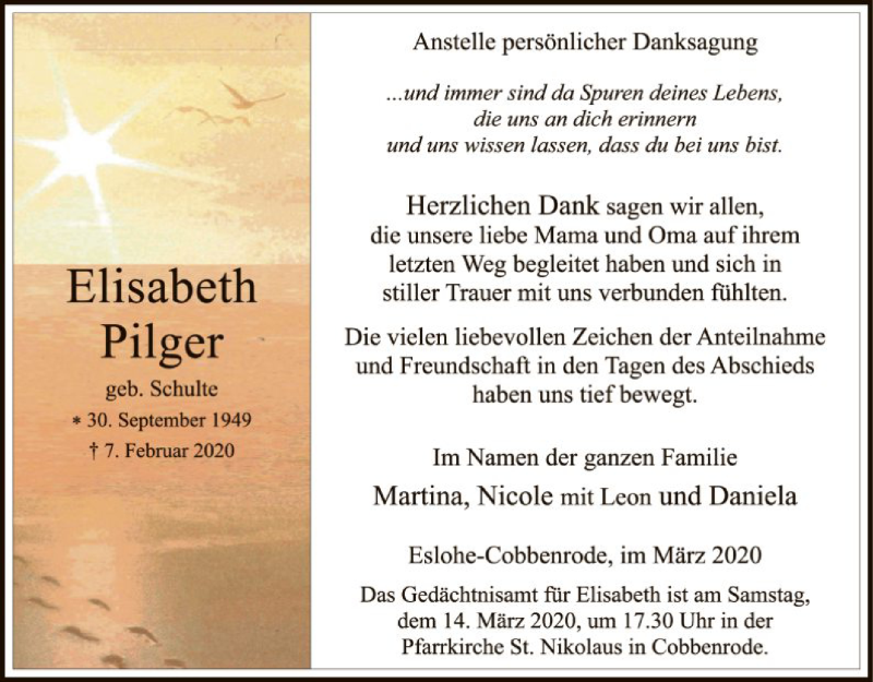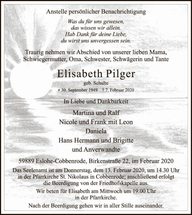 Hier finden Sie alle Traueranzeigen aus der Zeitung, die bisher für Elisabeth Pilger erschienen sind. Weitere Traueranzeigen, die in der Zeitung erscheinen, werden hier ebenfalls aufgelistet