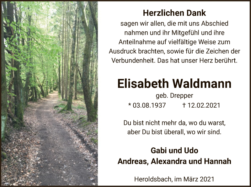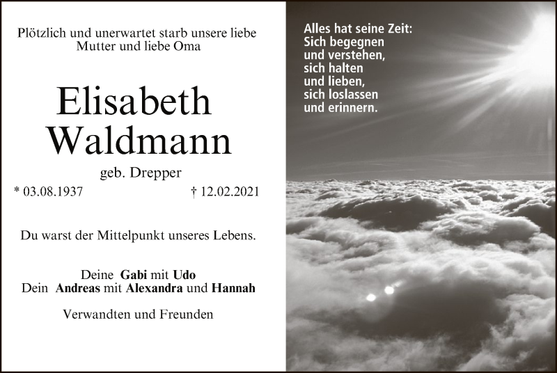 Hier finden Sie alle Traueranzeigen aus der Zeitung, die bisher für Elisabeth Waldmann erschienen sind. Weitere Traueranzeigen, die in der Zeitung erscheinen, werden hier ebenfalls aufgelistet