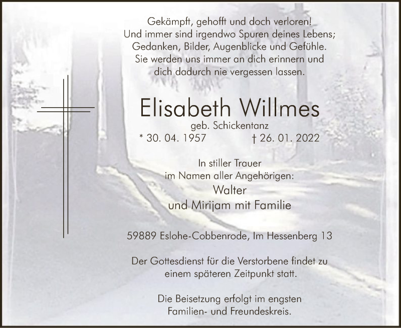 Hier finden Sie alle Traueranzeigen aus der Zeitung, die bisher für Elisabeth Willmes erschienen sind. Weitere Traueranzeigen, die in der Zeitung erscheinen, werden hier ebenfalls aufgelistet