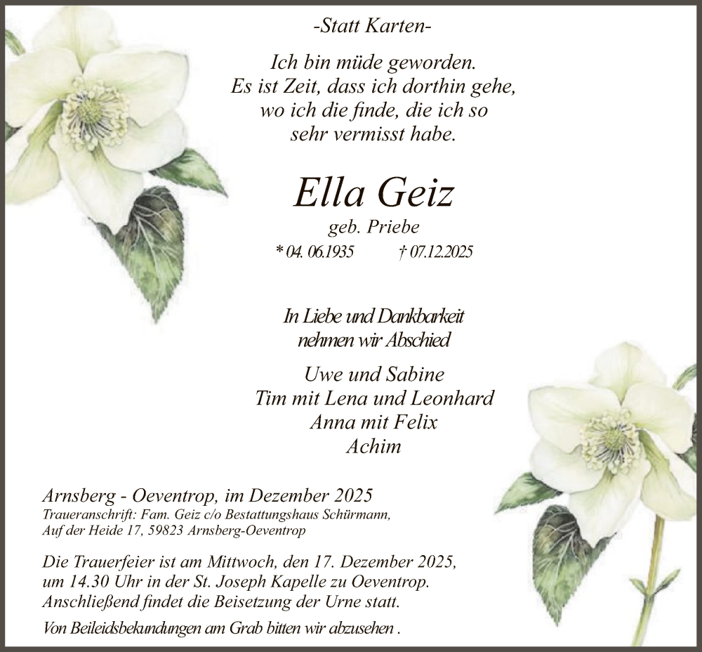 Hier finden Sie alle Traueranzeigen aus der Zeitung, die bisher für Ella Geiz erschienen sind. Weitere Traueranzeigen, die in der Zeitung erscheinen, werden hier ebenfalls aufgelistet