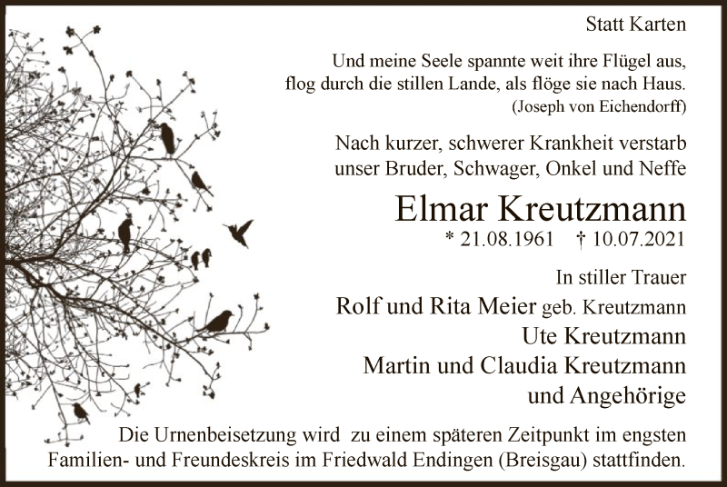 Hier finden Sie alle Traueranzeigen aus der Zeitung, die bisher für Elmar Kreutzmann erschienen sind. Weitere Traueranzeigen, die in der Zeitung erscheinen, werden hier ebenfalls aufgelistet