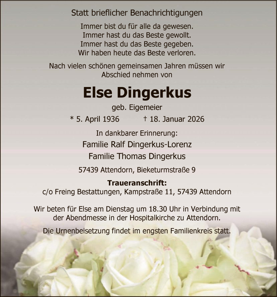Hier finden Sie alle Traueranzeigen aus der Zeitung, die bisher für Else Dingerkus erschienen sind. Weitere Traueranzeigen, die in der Zeitung erscheinen, werden hier ebenfalls aufgelistet