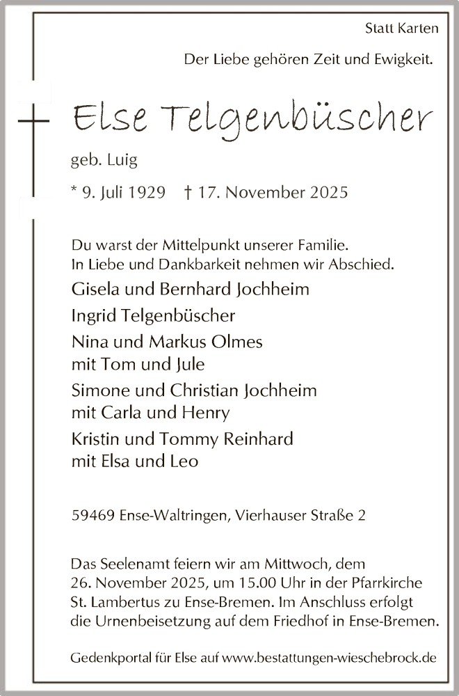 Hier finden Sie alle Traueranzeigen aus der Zeitung, die bisher für Else Telgenbüscher erschienen sind. Weitere Traueranzeigen, die in der Zeitung erscheinen, werden hier ebenfalls aufgelistet