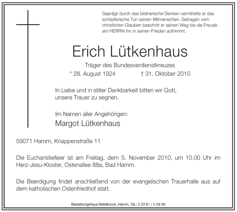 Hier finden Sie alle Traueranzeigen aus der Zeitung, die bisher für Erich Lütkenhaus erschienen sind. Weitere Traueranzeigen, die in der Zeitung erscheinen, werden hier ebenfalls aufgelistet