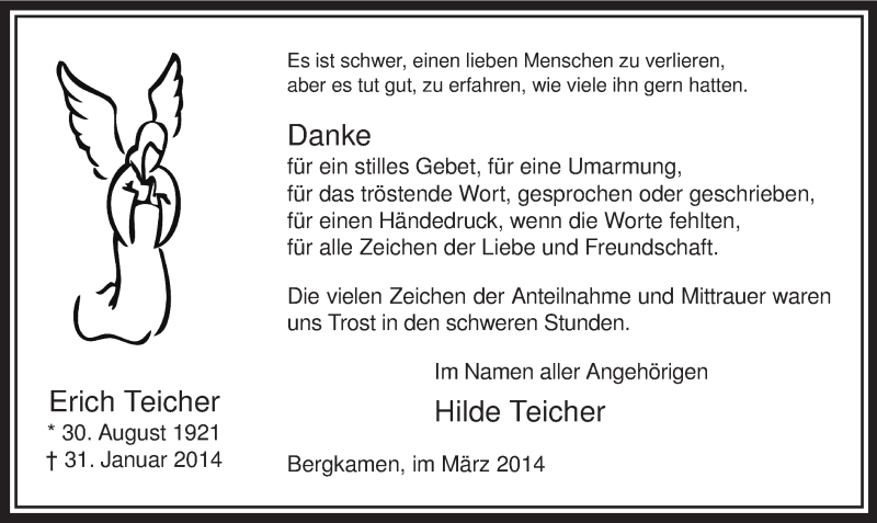 Hier finden Sie alle Traueranzeigen aus der Zeitung, die bisher für Erich Teicher erschienen sind. Weitere Traueranzeigen, die in der Zeitung erscheinen, werden hier ebenfalls aufgelistet