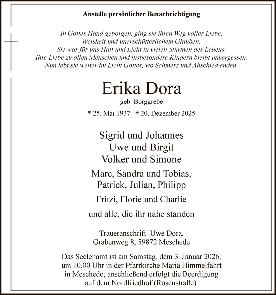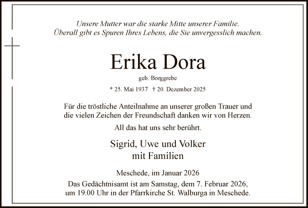 Hier finden Sie alle Traueranzeigen aus der Zeitung, die bisher für Erika Dora erschienen sind. Weitere Traueranzeigen, die in der Zeitung erscheinen, werden hier ebenfalls aufgelistet