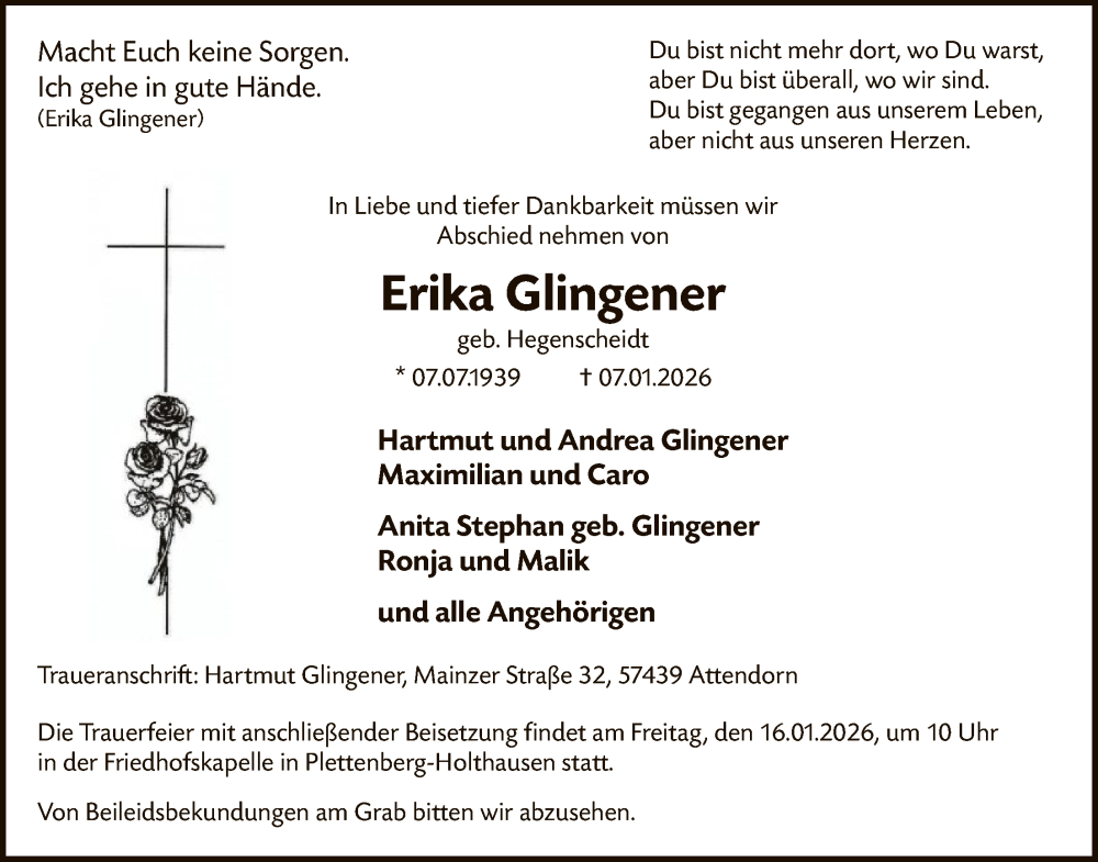 Hier finden Sie alle Traueranzeigen aus der Zeitung, die bisher für Erika Glingener erschienen sind. Weitere Traueranzeigen, die in der Zeitung erscheinen, werden hier ebenfalls aufgelistet