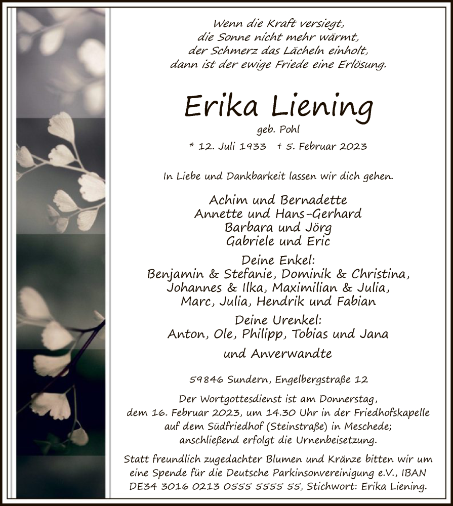 Hier finden Sie alle Traueranzeigen aus der Zeitung, die bisher für Erika Liening erschienen sind. Weitere Traueranzeigen, die in der Zeitung erscheinen, werden hier ebenfalls aufgelistet