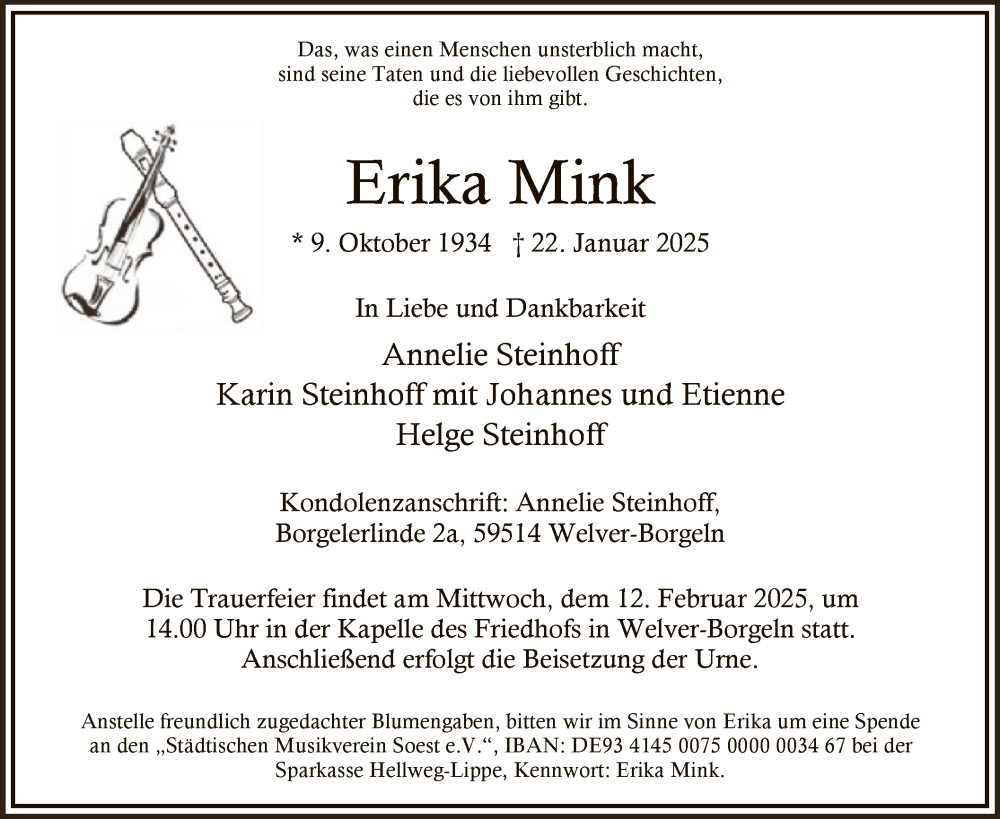 Hier finden Sie alle Traueranzeigen aus der Zeitung, die bisher für Erika Mink erschienen sind. Weitere Traueranzeigen, die in der Zeitung erscheinen, werden hier ebenfalls aufgelistet
