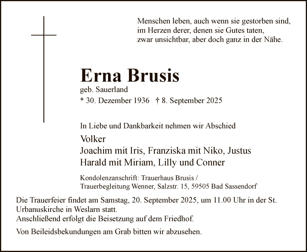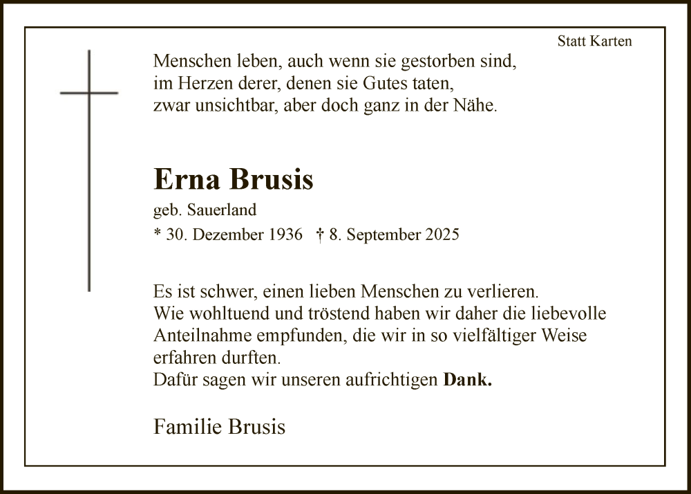 Hier finden Sie alle Traueranzeigen aus der Zeitung, die bisher für Erna Brusis erschienen sind. Weitere Traueranzeigen, die in der Zeitung erscheinen, werden hier ebenfalls aufgelistet