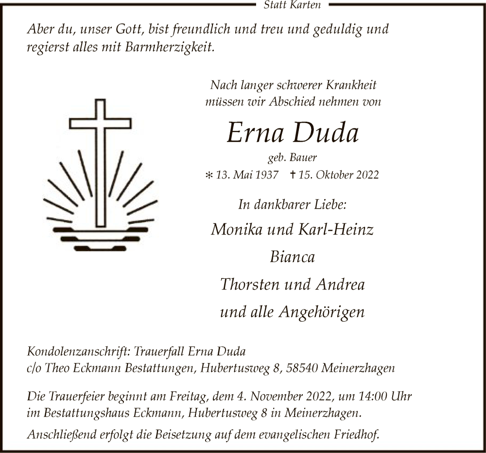 Hier finden Sie alle Traueranzeigen aus der Zeitung, die bisher für Erna Duda erschienen sind. Weitere Traueranzeigen, die in der Zeitung erscheinen, werden hier ebenfalls aufgelistet