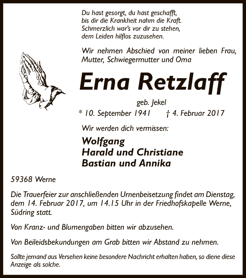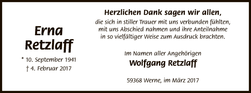 Hier finden Sie alle Traueranzeigen aus der Zeitung, die bisher für Erna Retzlaff erschienen sind. Weitere Traueranzeigen, die in der Zeitung erscheinen, werden hier ebenfalls aufgelistet